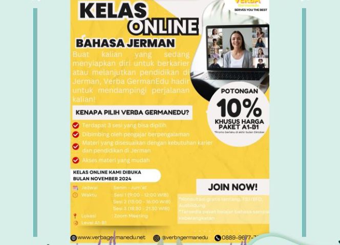 Kelas online juga bakal dibuka November ini! Join sekarang dan wujudkan impianmu ke Jerman bersama Verba GermanEdu!