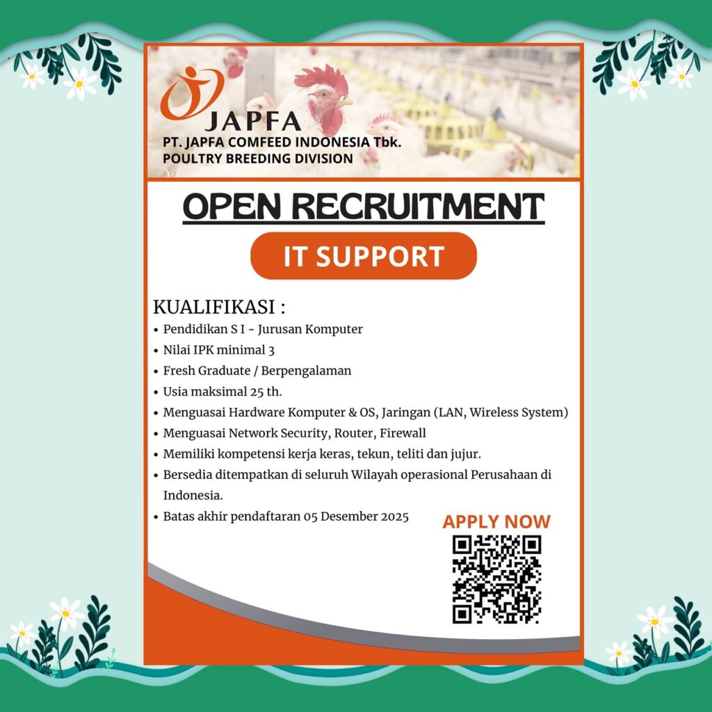 PT. JAPFA COMFEED INDONESIA Tbk. membuka kesempatan bagi para profesional muda di bidang Teknologi Informasi. Kami mengundang kandidat terbaik untuk bergabung sebagai IT SUPPORT.