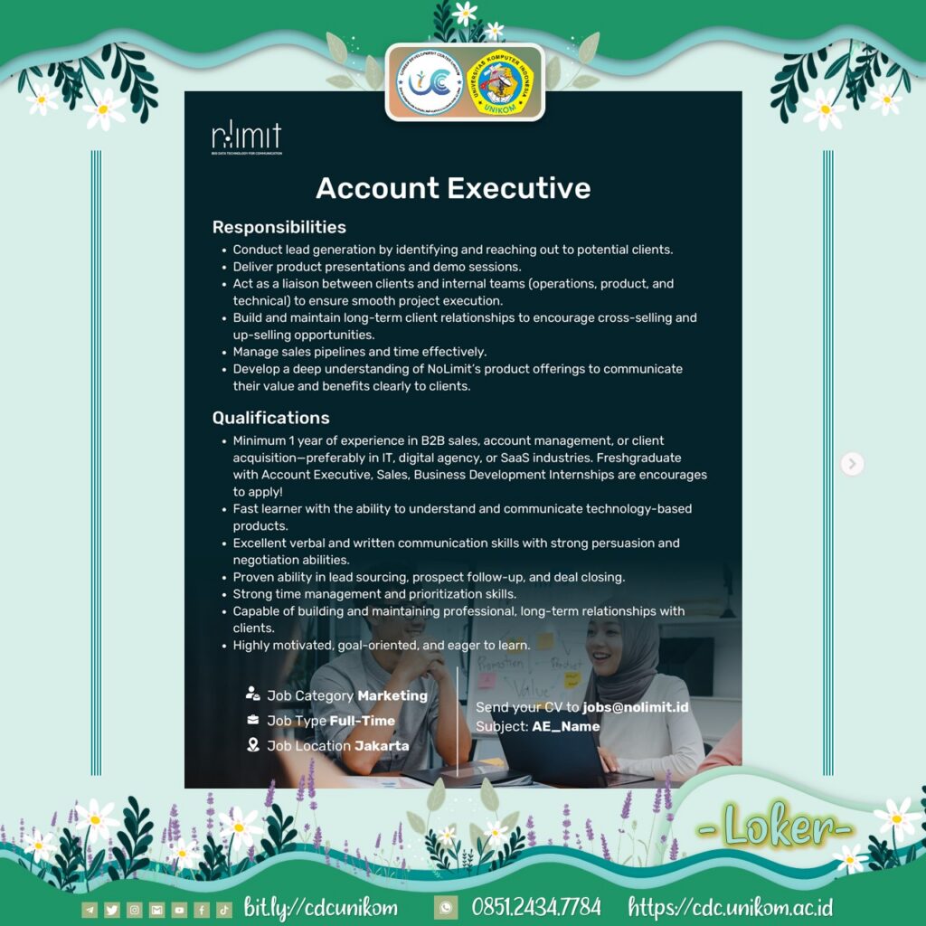 #NoLimit #WeAreHiring #CareerOpportunity #HiringNow #DataScientist #BackendEngineer #FrontendDeveloper #AccountExecutive #DataEngineer #LowonganKerja #LokerBandung #LokerJakarta #CDCUNIKOM
