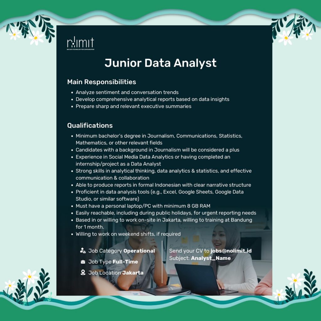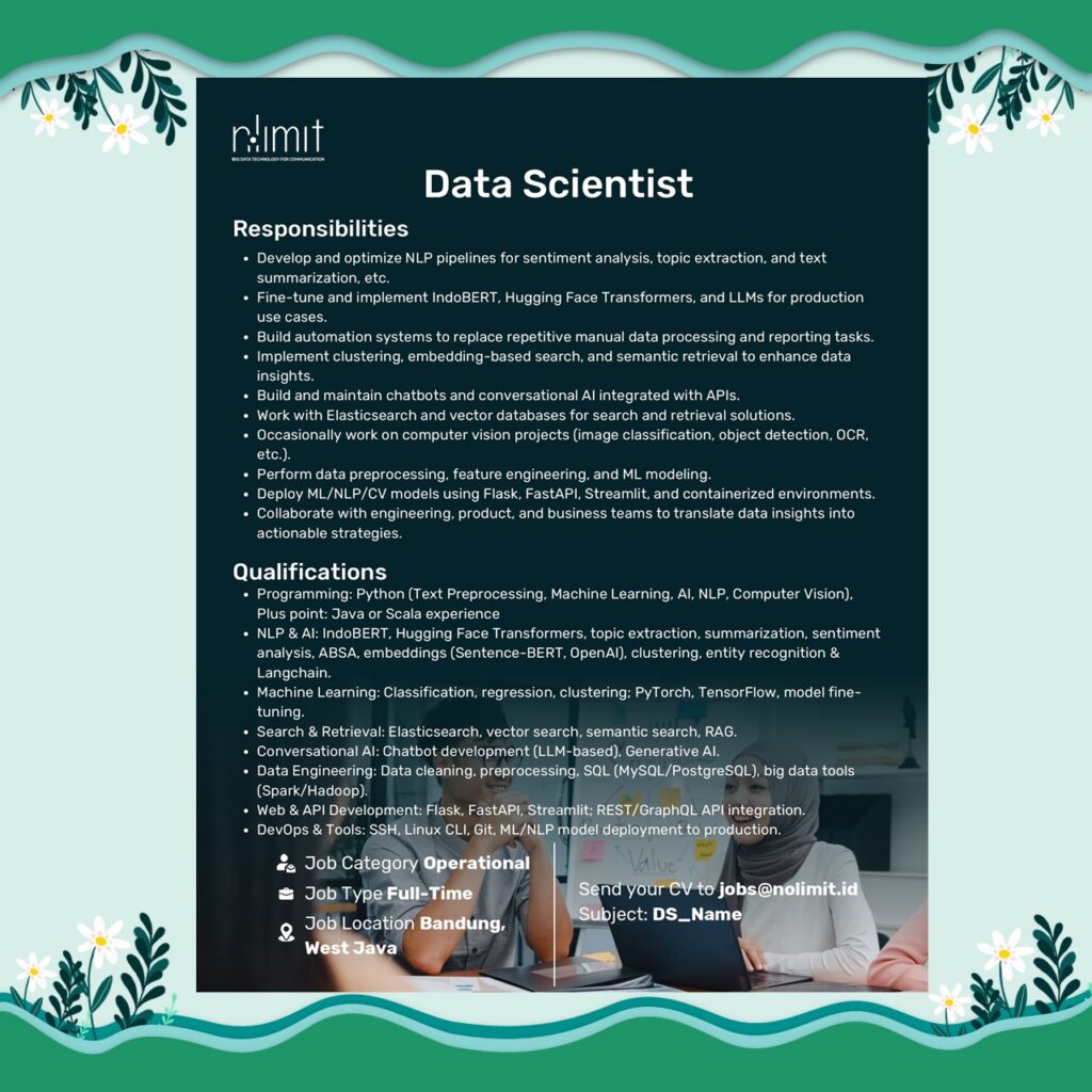 Saatnya berkembang bersama NoLimit Indonesia — perusahaan teknologi yang fokus pada data, digital insight, dan solusi berbasis AI!