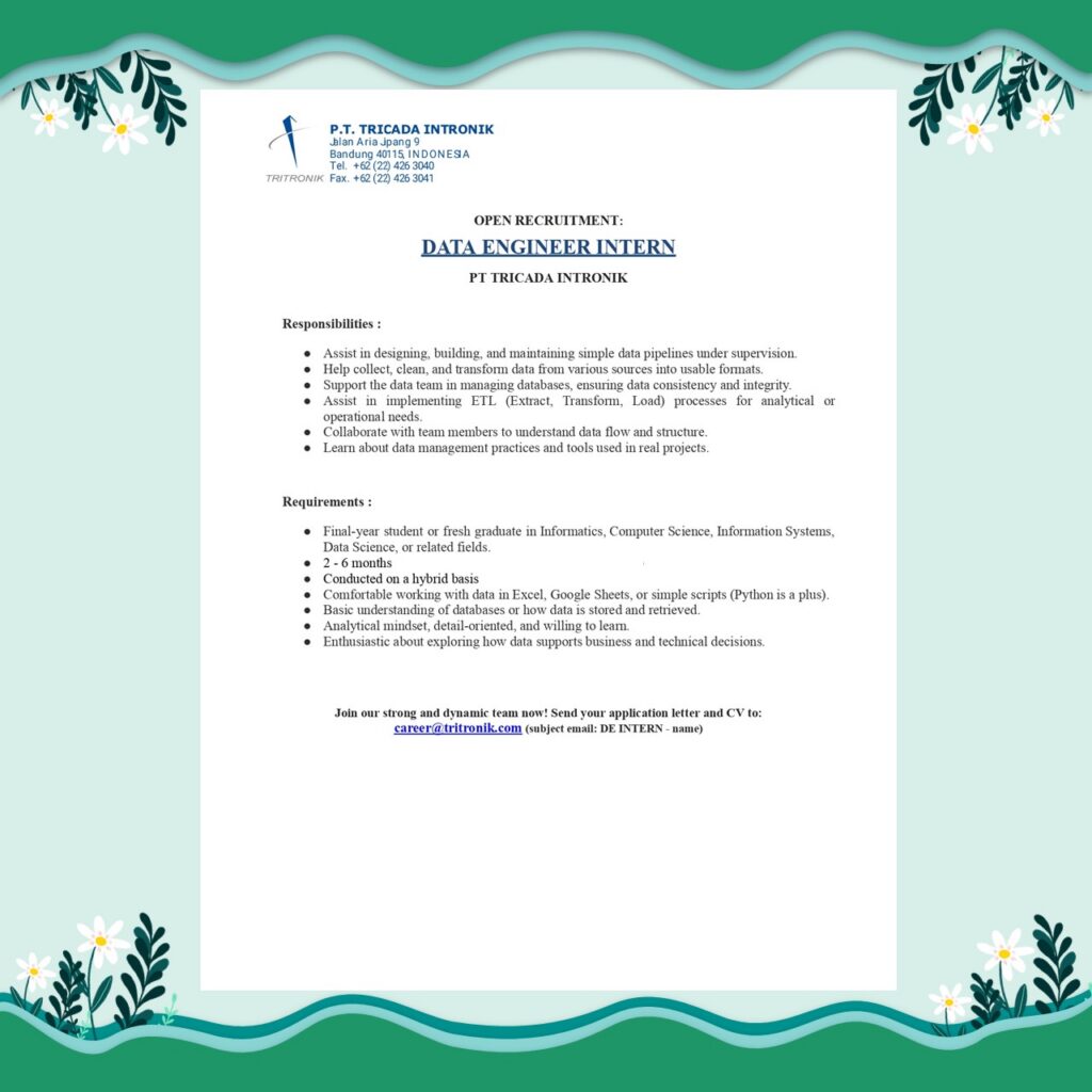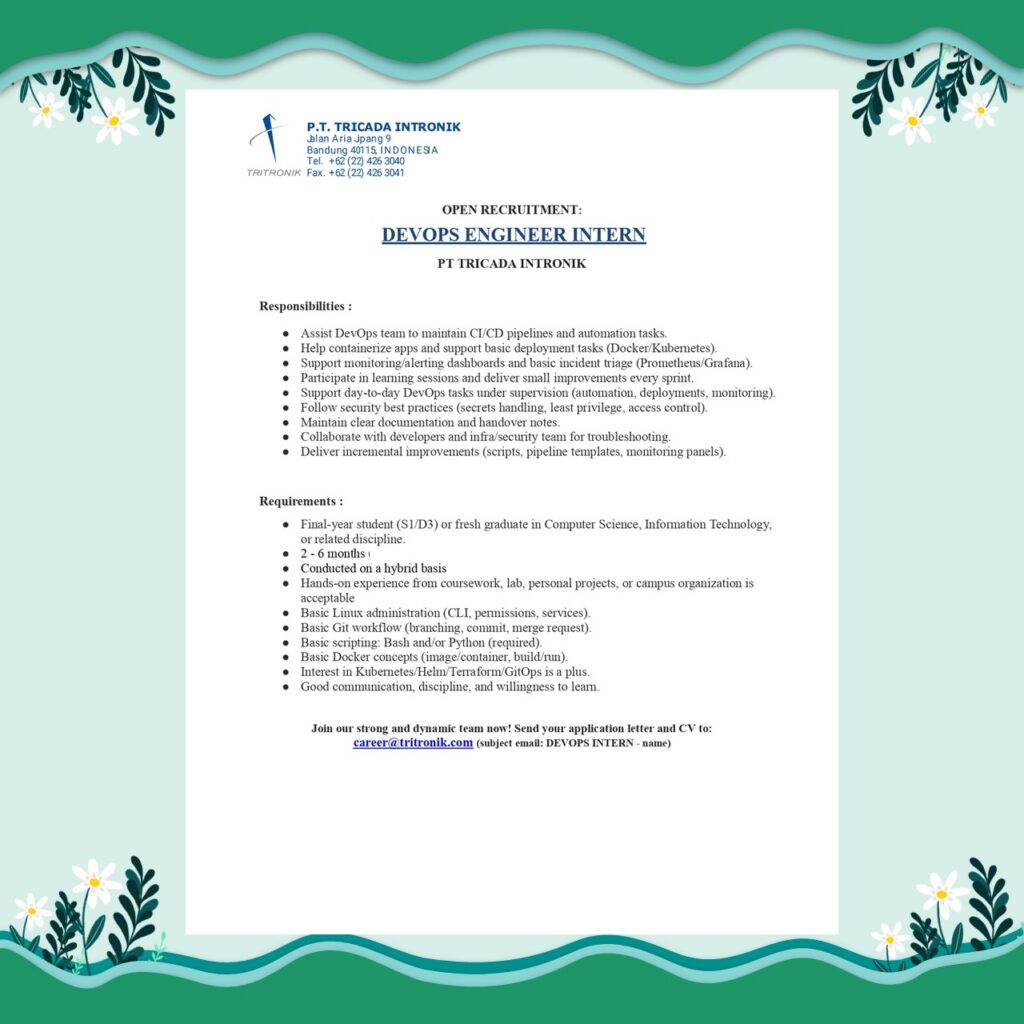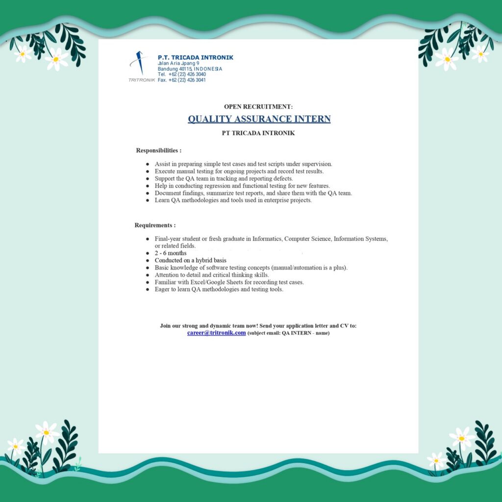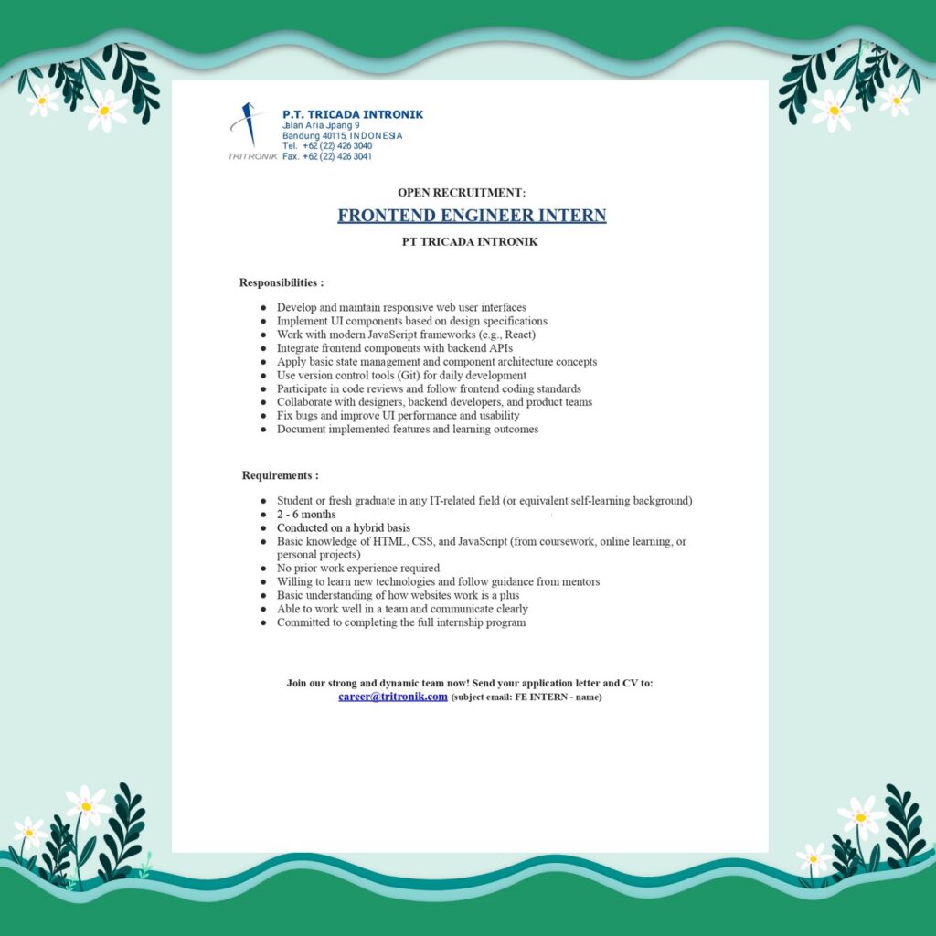 PT Tricada Intronik membuka kesempatan magang (internship) bagi mahasiswa tingkat akhir / fresh graduate untuk bergabung dalam tim profesional dan dinamis pada posisi: