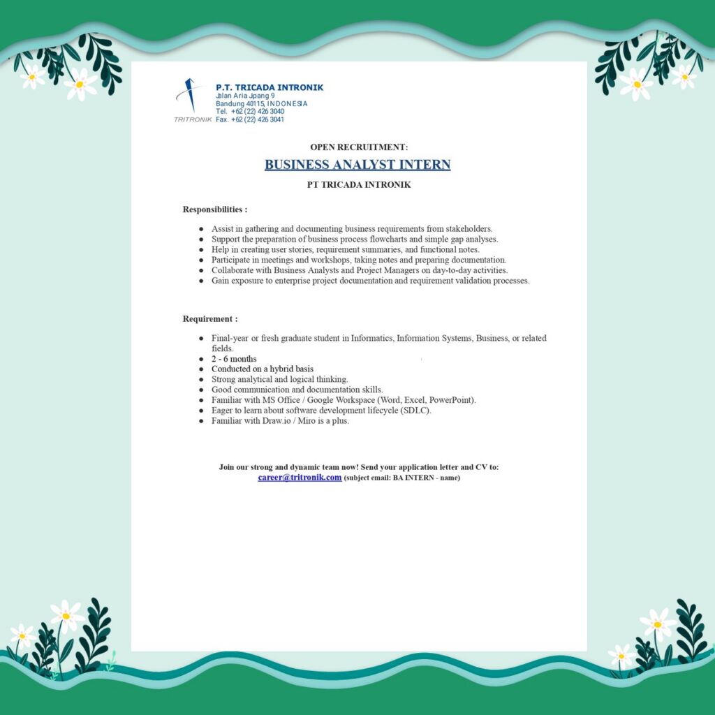 📌 Kualifikasi: Mahasiswa tingkat akhir / fresh graduate bidang Informatika, Sistem Informasi, Teknik Komputer, dan bidang terkait.