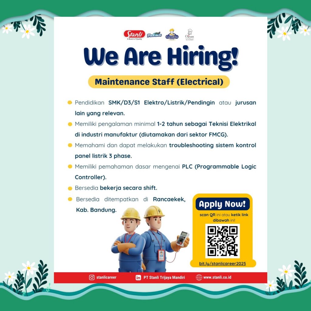 #StanliCareer #LowonganKerja #LokerBandung #LokerRancaekek #MaintenanceStaff #ElectricalJob #KarirManufaktur #WeAreHiring #JobVacancy #KarirStanli #FMCG #CDCUNIKOM
