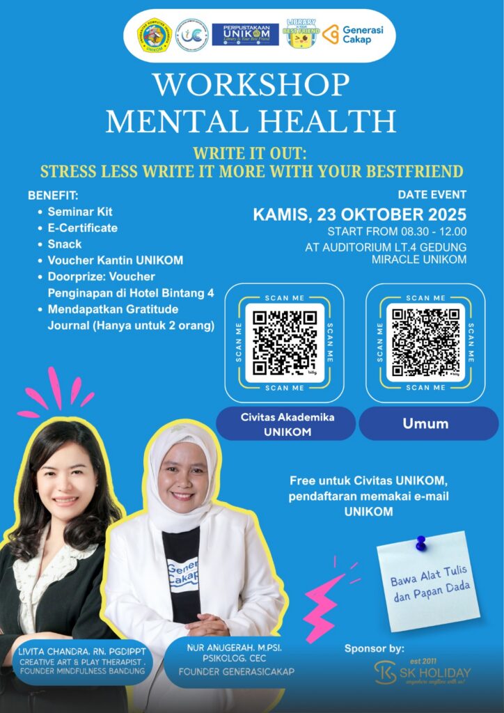 Untuk memperingati Hari Gerakan Pemasyarakatan Minat Baca dan Hari Kesehatan Mental, Direktorat Perpustakaan UNIKOM beserta CDC UNIKOM dan Psikolog dari Generasi Cakap akan menyelenggarakan Workshop Mental Health :